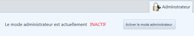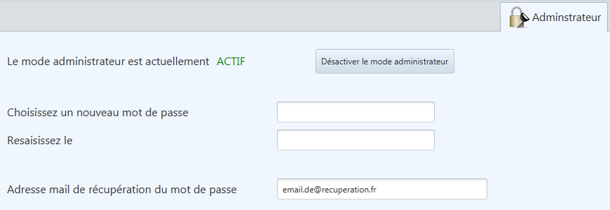 Le bouton ‘Activer’ permet de définir un mot de passe et un email de récupération pour demander l’activation du mode Administrateur.