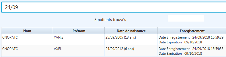 Afin de limiter le nombre de résultats, la recherche ne s’effectue qu’à partir de 2 caractères saisis. La recherche s’effectue pour chaque mot saisi et simultanément sur le nom, le prénom, l’âge ou la date de naissance et la date d’enregistrement du patient. Plus il y a de mots saisis, plus la recherche est sélective. La recherche s’effectue quel que soit la casse (majuscule, minuscule) et indépendamment des accents et caractères spéciaux. Par exemple : ‘Er’ recherche tous les noms et prénoms commençant par ‘er’ ou ‘ér’ ou ‘èr’ ou ‘êr’ ou ‘ër’.