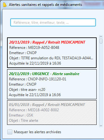 En haut de la liste des messages, une zone de recherche permet de rechercher un message d’alerte par :